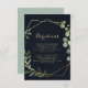 Este cartão de cerimônia de casamento verde-azul de ouro geométrico é perfeito para um casamento simples. A design apresenta lindas folhas verdes pintadas manualmente em um fundo azul escuro, enfeitando uma armação geométrica dourada.