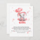Adorável convite para o chá de fraldas com um lindo elefante bebê segurando balões cor-de-rosa em forma de coração, cercado por estrelas delicadas. O design do estilo aquoso macio em rosa pastel e cinzas cria uma atmosfera doce e sonhadora, perfeita para celebrar a chegada de um pequeno. Uma faixa rosa adorável na parte inferior oferece espaço para personalização, fazer ideal para o chá de uma menina.