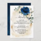 Cartão de detalhes de casamento floral azul marinho escuro com buquê elegante de azul marinho, azul real, branco, dourado, champanhe marfim, rosa cor de blush, botões de flor de ranúnculo e folhas de eucalipto verde-sage e aquarela elegante com moldura geométrica de brilho redondo. Por favor, entre em contato comigo para qualquer ajuda na personalização ou se você precisar de qualquer outro produto com este design.
