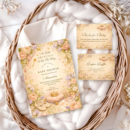 Celebrate a sweet arrival with this dreamy Little Princess baby shower design, featuring a soft celestial scene filled with moons, stars, delicate florals, and golden crown details. The pastel lavender and blush tones create a magical, storybook atmosphere that feels gentle, elegant, and timeless. Perfect for a princess-inspired celebration with a modern, whimsical touch, this design is ideal for creating a warm and enchanting moment to welcome baby.