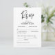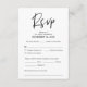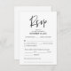 Este é o lindo cartão de resposta de convite de Elegância Casual Moderna, minimalista e moderno, com fonte preta, onde você pode editar, alterar a cor e formatar de acordo com a sua necessidade de design, com opções de refeição, assentos reservados, número de participantes e opção de pedido de música.