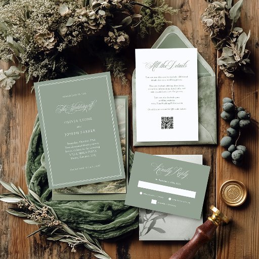 Estes elegantes, brancos e sábios detalhes de núpcias de núpcias, inserem cartões clássicos, estilo antigo com caligrafia romântica. Adicione o seu site de casamento, ou simplesmente digite os detalhes sobre acomodações de hotel, instruções de condução e outras informações importantes para seus convidados. Ponha o tom para o seu luxo e sofisticado casamento italiano inspirado nesta design minimalista e elegante.