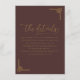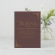 This elegant wedding enclosure card features a deep maroon background with gold accents, creating a sophisticated and formal atmosphere. The design includes a cursive script for the title "the details" and classic serif typography for the instructions, ensuring clarity and refinement. Decorative geometric patterns frame the text, adding symmetry and balance to the layout. Perfect for conveying important information about accommodations and additional details, this card is customizable, making it adaptable for various weddings while maintaining an air of elegance and tradition.