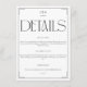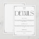 Share all the essential wedding reception and accommodation details with your guests using this elegant and modern enclosure card. Featuring a sophisticated minimalist design with a black and white color scheme, this card adds a touch of class to your wedding stationery suite. The top showcases a chic monogram with the initials 'G|M', followed by a bold 'DETAILS' title. The body of the card clearly outlines reception information and accommodation details, including a hotel name, address, and a reference number for a discounted rate. A dedicated section for 'MORE DETAILS' directs guests to your wedding website for additional information. This minimalist enclosure card is perfect for couples seeking a refined and understated aesthetic for their special day.