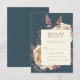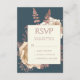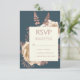 Este elegante cartão de cercado RSVP de casamento apresenta um buquê floral robusto e romântico em marfim com folha de ouro rosa e folhagem brilhante num fundo azul teal. Personalize o texto cor-de-rosa rosa em fontes na moda num retângulo de marfim. A parte traseira da placa é sólida.