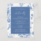 Este cartão de encerramento azul e branco, elegante e refinado, apresenta uma bela bordadura floral inspirada em toile e um centro nítido e minimalista para os detalhes do seu casamento. Uma tipografia lindamente equilibrada combina uma escrita graciosa com letras serifadas clássicas para um sentimento atemporal e romântico. Totalmente personalizável com seus nomes, data do casamento, detalhes e localização, este design é perfeito para anunciar sua celebração com estilo. Uma escolha ideal para casamentos tradicionais, de jardim ou à beira-mar, que dá a primeira impressão perfeita para o seu dia especial.