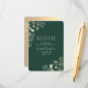 Cartão de recepção de casamento verde esmeralda, elegante e elegante, com rendas florais douradas e um simples roteiro de caligrafia.