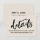 Mantenha seus convidados de casamento em loop com todos os seus detalhes usando esses cartões de núpcias bonito e modernos. Uma sobreposição de texto casual foi projetada usando uma fonte escrita manualmente em preto, simplesmente lendo "detalhes". Use os campos modelo para personalizar essas placas de gabinete com suas informações pessoais. A cor de fundo pode ser alterada para qualquer coisa da paleta de casamento que você escolher; todo o texto editável aparece em preto. 100 //