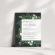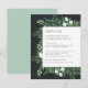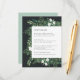Projetado para coordenar com a nossa coleção de casamentos de Estufa, este elegante cartão de informação botânica de inverno apresenta uma fronteira de folhagem verde de aquarela, folhas botânicas e pequenas flores brancas que enquadram seus principais detalhes de casamento, como acomodações de hotel, informações de recepção bem-vindas, site e muito mais em um rico fundo fora de preto.