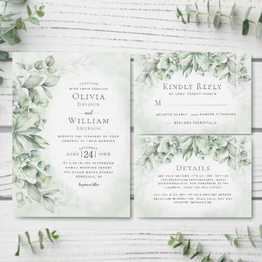 Dê aos seus convidados todos os detalhes importantes com este adorável cartão verde de casamento. Apresenta um delicado buquê sonhador de verde-aquarela botânica eucalipto que desaparece no fundo, com uma textura verde-aquosa sádica, e um elegante monograma moderno numa coroa foliar esmagadora no verso. Localize produtos correspondentes para concluir o conjunto de convites, na coleção.