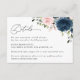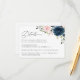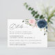 Preencha a suíte de papelaria de casamento com este cartão de detalhes de na moda. Design apresenta marinho e flores cor-de-água cor-de-rosa pinceladas e verde sobre fundo branco.