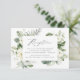 Cartão de recepção floral elegante, branco, com os seus detalhes de recepção, enquadrado por jardinas brancas pintadas, hálito de bebê, folhas verdes de sage e folhas verdes vibrantes. Personalize os cartões de recepção botânicos adicionando tempo, nome do local, endereço e informações adicionais. Projetado para coordenar com a nossa coleção de casamento Lush White Flowers e Greenery.
