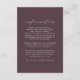 Com a sua rica e sazonal queda de ameixa e a elegante tipografia, este cartão de informação de casamento coordena-se perfeitamente com a Design de Lea Delaveris folhas de outono da coleção de casamentos de outono. Com seu design simples, ele também pode ser usado para combinar outras coleções de casamento e a cor de fundo pode ser alterada clicando em "personalizar mais".