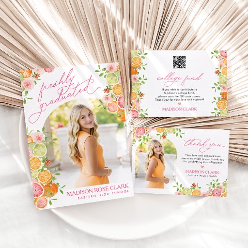 This insert is perfect for including with your graduation party invitations to politely share college fund or gift preferences with guests. Featuring bright oranges, limes, grapefruits, soft florals, and a cheerful summer-inspired design.