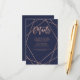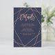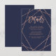 Esses cartões de detalhes para convidados de casamento contemporâneo apresentam um fundo azul escuro e linhas geométricas em dourado rosa falso para um visual moderno e ousado.