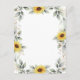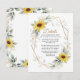 O design apresenta greenery aquarela, girassóis, elementos dourados impressos e folhas botânicas aéreas sobre uma moldura geométrica impressa em cor dourada. A parte de trás apresenta uma grinalda de greenery e girassol correspondente.