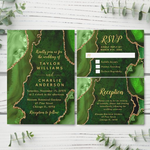 Cartão De Informações Green and Gold Agate Wedding Details