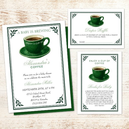 This design features a old money vintage baby shower theme with a green coffee cup illustration and elegant borders giving it a luxury coffee shop vibe. This product can be easily personalized. If you need help with the customization of the product or need matching products kindly please contact me via Zazzle.