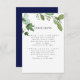 Deslize estas cartas chic e petite nos seus convites de casamento para que os seus convidados saibam as instruções, as acomodações de viagem ou outras informações úteis sobre convidados de casamento. Projetado para coordenar com a nossa coleção de casamentos de cor aquática Hedera boho, este elegante cartão de casamento botânico apresenta uma ilustração de folhas de cor aquosa e folhagem exuberante que cobre seus detalhes de acomodação de texto personalizado. Placa inversa para fundo azul de marinho rico coordenado Outras cores disponíveis