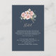 Este cartão de hotel floral de rosa de jardim de eucalipto é perfeito para um casamento rústico. A design apresenta flores rosa, pinceladas, amarelas, com folhas de eucalipto em fundo azul-marinho escuro.