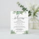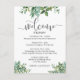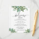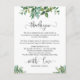 Folhas de aguarela verde adornam este cartão para dar as boas-vindas aos seus convidados de casamento e informá-los sobre os eventos planejados. Um cartão compacto que pode ser adicionado a uma bolsa de lembrança com uma fonte moderna (as palavras em script não são editáveis). Nossa ilustração exclusiva.