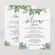 Folhagem em aquarela verde adorna este cartão para dar as boas-vindas aos seus convidados de casamento e informá-los sobre os eventos planejados. Um cartão compacto que pode ser adicionado a uma bolsa de lembrança com uma fonte moderna (As palavras em script não são editáveis). Nossa ilustração única.