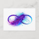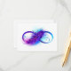 Símbolo infinito com uma bela pena pintada em cores roxas e azuis brilhantes sobre fundo branco.