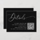 Simplifique sua papelaria de casamento com este moderno cartão de detalhes de casamento, projetado em um estilo minimalista com um roteiro elegante em um fundo preto. Esta placa de gabinete oferece um espaço para um código QR personalizado, permitindo que os convidados acessem instantaneamente seu site de casamento, formulário RSVP, registro ou instruções digitais. Não é necessário digitar! Quer você esteja planejando um caso de gravata negra, uma comemoração da cidade quica, ou um casamento minimalista contemporâneo, este cartão de inserção versátil adiciona um toque polido à sua suíte de convites. Coordene-o com peças correspondentes da mesma coleção de design para uma aparência coesa. Uma escolha excelente para casais que querem um design limpo e moderno com um toque pessoal.
