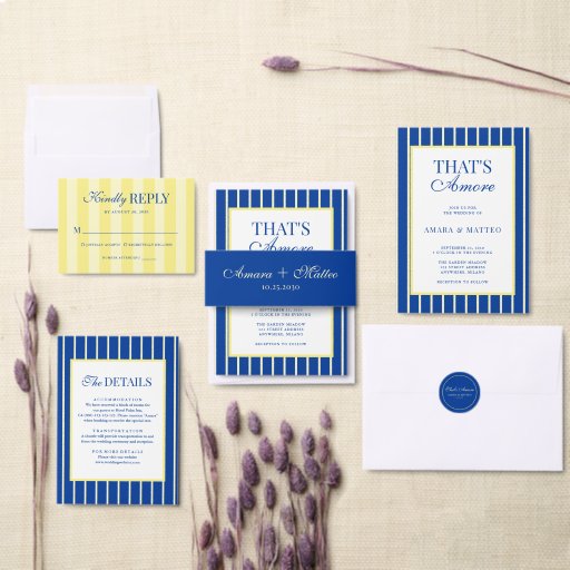 A modern yet timeless wedding details card featuring light yellow and butter yellow stripes that evoke warmth and sophistication. The design is elevated with blue typography, striking a perfect balance between minimalist clarity and elegant Italian flair. The overall aesthetic whispers old money elegance—refined, understated, and effortlessly chic. The striped palette recalls sunlit Italian villas, while the vintage typography adds a touch of aristocratic charm. Together, these elements create an invitation that is minimalist yet luxurious, romantic yet dignified, and unmistakably Italian in spirit.