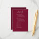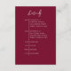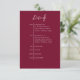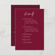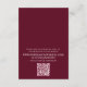Cartão de cerimônia de detalhes de casamento com um código QR e uma linha cronológica digitalizáveis, com um fundo burgundy, com nossos casamentos no site, com caligrafia elegante mínima perfeita para detalhes e informações de recepção de casamento.