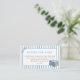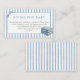 O design do cartão de inclusão do livro de chá de bebê COLBY apresenta um fundo de listras de gêmeo azul claro e branco com um chocalho de gêmeo e uma pilha de livros de gêmeo.