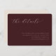 This elegant wedding enclosure card features a sophisticated maroon background with an understated, cursive typography that exudes timeless charm. The design is simple yet refined, focusing on providing essential details in a graceful manner. Perfect for couples aiming to maintain a classic and polished aesthetic at their special event, this card ensures all guests have the necessary information while complementing the overall wedding theme. Its clean layout allows it to seamlessly integrate into any formal or traditional wedding setting.