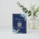 Elegante rosas azuis e brancas decoram este belo cartão de cervejaria floral de lua de mel. A estrutura de folha de ouro falso em chic é acentuada por flores bonito de cor d'água indigo e por uma adorável cinta botânica amarela clara. Adicione seu código QR ao seu site de casamento.