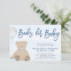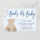 Livros para chá de bebê menino, cartão de inserção. Um adorável urso de pelúcia marrom sentado segurando um balão em um fundo azul claro em aquarela.