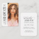 Simple mini size graduation announcement and invitation features elegant typography design with timeless serif font and classic calligraphy with photos, additional grad party information on the back, modern and classic.