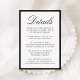 This wedding details card features “Details” in elegant black calligraphy script at the top, followed by your custom wedding information presented in classic serif lettering. A bold black border frames the design, creating a clean, refined look that feels timeless and polished. The structured layout provides a beautiful way to share accommodations, weekend events, and important information with your guests, making this black and white details card ideal for modern, classic, and formal wedding celebrations. Personalize the wording to create an insert that feels cohesive, elevated, and thoughtfully designed.