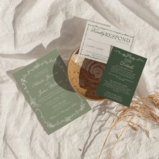 Simple and stylish retro wedding guest info details. With emerald green background and white text layout with whimsical old money classy wordings. And outline floral border. All the info are customizable as website, transportation, accommodation . Grab it along with other products from this classy hand made retro wedding suite.