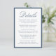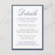 This wedding details card features “Details” in refined navy calligraphy, paired with classic serif typography for your accommodations, reception information, and wedding website. The deep navy border frames the design with a tailored, polished finish that feels both timeless and formal. With its crisp contrast and elegant typography, this card is well-suited for traditional, black-tie, coastal, and evening weddings, offering a sophisticated way to share important guest information.