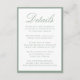 This wedding details card showcases “Details” in soft sage green calligraphy with coordinating serif text below for your hotel, reception, and website details. The sage green border adds a fresh, botanical touch while maintaining a clean and modern layout. Ideal for garden, estate, vineyard, and garden weddings, this design blends natural elegance with classic typography for a look that feels calm, romantic, and thoughtfully curated.