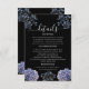 A bold and sophisticated Enclosure Card featuring dramatic dusty blue and grey floral illustrations against a stark black background. The crisp white typography and classic layout set an elegant, moody tone. Perfect for a formal evening or a sophisticated wedding.