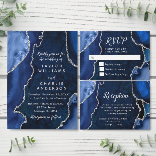 Cartão De Informações Navy Blue and Silver Agate Wedding Reception