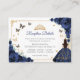 Navy, gold and white Quinceanera reception details enclosure cards. Features brunette girl in ball gown dress, script font, gold butterflies, roses and tiara. Perfect for an elegant princess style glam celebration. Personalize with your own details.