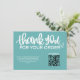 Expresse sua gratidão com nosso código QR azul aqua "Obrigado pela sua compra" Inserção do pacote de cartão. Seu cliente digitaliza o código QR para revelar uma mensagem sincera, ofertas exclusivas ou um obrigado personalizado que você nota, adicionando um toque especial à experiência de compro do cliente. Mostre apreço e promova lealdade com este pacote inovador e ponderado.
