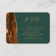 A borda esquerda deste elegante e moderno cartão de cerimônia de núpcias apresenta uma laranja queimada e uma cor-de-água ferrugem borda cortada com falsa brilho dourado. O título aparece em um script de escrita manuscrita dourado, com texto personalizável abaixo em uma fonte em copperplate em um fundo verde escuro. Digite o URL do seu site de casamento para gerar um código de QR no verso, enquadrado pelas palavras "digitalize-me para RSVP".