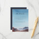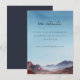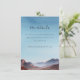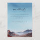 Este cartão de inclusão de casamento apresenta uma paisagem serena em aquarela com montanhas em camadas em tons suaves de azul e roxo, contrastadas por colinas quentes avermelhadas. O céu transita de um azul claro para um azul profundo, criando uma atmosfera tranquila. A tipografia cursiva elegante destaca "os detalhes", enquanto o texto simples sem serifa fornece informações adicionais. O estilo semi-realista do design evoca relaxamento e antecipação, tornando-o perfeito para compartilhar detalhes do evento do casamento.