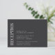 Um pequeno cartão de convite para o casamento para os detalhes da sua recepção, com "Recepção" no lado esquerdo em letras brancas clássicas, e os detalhes da sua recepção alinhados no canto inferior esquerdo. Projetado para combinar com a nossa coleção de casamentos paralelos. A nossa cinza de Cinza faz uma declaração clássica com letras brancas nítidas sobre um fundo preto suave.