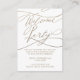 Este cartão de boas-vindas à caligrafia de ouro romântico é perfeito para um casamento moderno. O clássico design moderno apresenta espirais de rico e turbilhões brancos com elegantes e elegantes champanhes de ouro falso. Nota: Este design não apresenta folha de ouro real. É um gráfico de alta qualidade feito para se parecer com folhas de ouro.