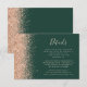 A borda esquerda deste elegante e moderno cartão de detalhes de casamento contém um design brilhante falso de pêssego. O texto personalizável combina manuscrito de pêssego pálido, fontes em copperplate e itálico em um fundo verde escura esmeralda. O verso apresenta um design de brilho de pêssego correspondente.