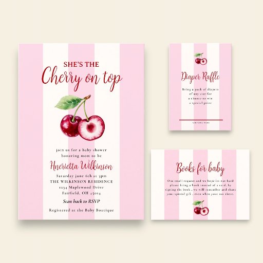 Cartão De Informações Pink Stripes Cherry Books for Baby Shower