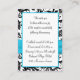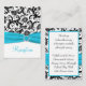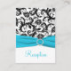 Este cartão de receptáculo de recepção de damasco preto e branco tem uma fita azul-aqua IMPRESSA e broche de joia de diamante IMPRESSO que seria perfeito para um casamento de aqua e temas negros. Alguns artigos irão alterar a cor do design, portanto, tenha cuidado se você escolher um dos tipos de papel além do branco básico mostrado aqui. ALÉM DISSO, se você redimensionar a placa, ou se você alterar fontes, ou o tamanho da fonte, parte do design e/ou texto poderá ser cortada. Tudo será impressão como você vê no seu monitor. Não verei o seu cartão, e Zazzle NÃO corrigirá nada (erros de digitação, alinhamento incorreto, etc.). O texto e o papel são todos personalizáveis. Se precisar de ajuda com este cartão, envie-me um e-mail ANTES de fazer seu pedido. Se você precisar de outros itens correspondentes, envie um e-mail para niteowlstudio@gmail.com